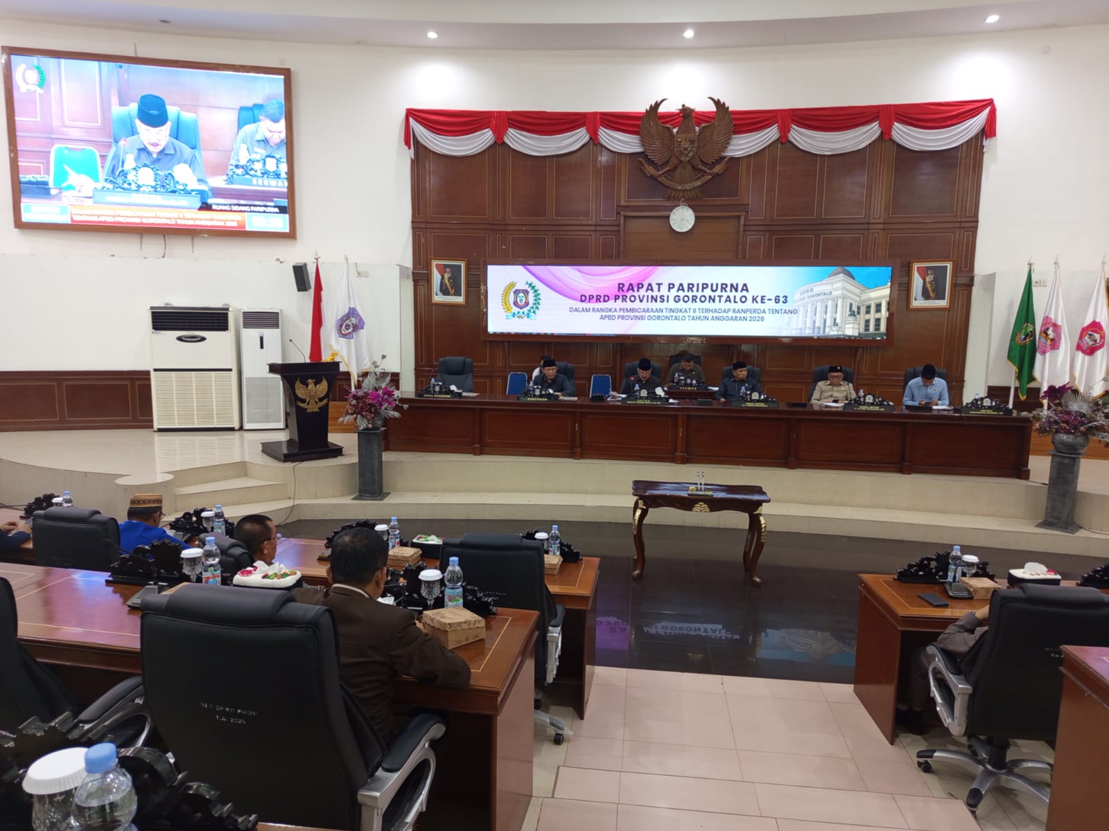 Humas Deprov – Rapat Paripurna Dewan Perwakilan Rakyat Daerah (DPRD) Provinsi Gorontalo ke-63 resmi digelar pada Jum’at, 28 November 2025, bertempat di Ruang Rapat Paripurna DPRD Provinsi Gorontalo. Rapat ini diselenggarakan dalam rangka Pembicaraan Tingkat II terhadap Rancangan Peraturan Daerah (Ranperda) tentang Anggaran Pendapatan dan Belanja Daerah (APBD) Provinsi Gorontalo Tahun Anggaran 2026.